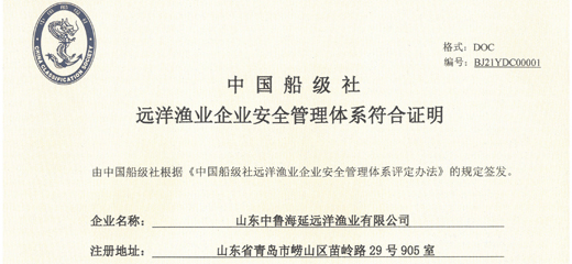中魯海延公司取得山東省內第一張由中國船級社(CCS)頒發的遠洋漁業企業安全管理體系符合證明。