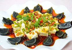 金槍魚松若干、冷凍豆腐2塊、皮蛋2個、麻油少許、鹽、味精少許。做法:1. 先將每個皮蛋以細線切割八等份。2. 在盤上鋪好冷凍豆腐及切好的皮蛋。