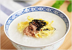 白米250克、油浸金槍魚罐頭2罐、沙拉油1湯匙(爆蔥用)、胡椒粉1茶匙、糖、味精、鹽少許、芹菜少許、高麗菜、蘿卜絲少許、蔥2條。爆蔥后加湯、米及蘿